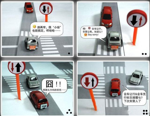第二、第三,会车让行和会车先行标志牌,这是很多人会忽略的。现实中经常会遇到一些狭窄道路,稍有不慎就会出现剐蹭事故,伤肝生气还费钱。这个标志就是提示道路的某一方应主动让行——会车让行标志中,红色箭头行驶方向的车辆应停车让行,黑色箭头行驶方向的车辆先行,注意,是停车让行,不是速度慢一点就可以的。